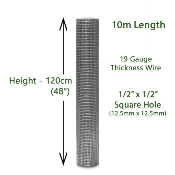 19 Gauge – 10m (120cm Wide) – 1/2″ x 1/2″ Hole Galvanised Welded Wire Mesh 19G