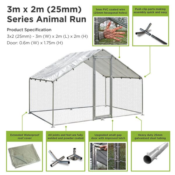 Framework: The 25mm frame on this chicken run offers the great strength and stability. It is made from high quality 25mm galvanised steel tubing. This galvanised steel will give you many years of corrosion free use.