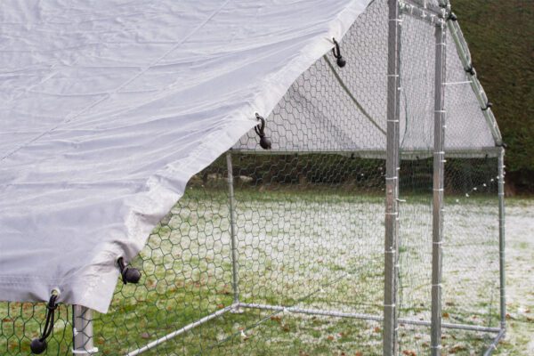 Cover: The 32mm chicken run option now includes an upgraded extended cover which provides coverage to the sides as well as the roof. The 4m x 8m sized model comes with two of these covers. All other sized models have a single extended cover. Bungee ties are included to fully attach the covers securely to the frame.